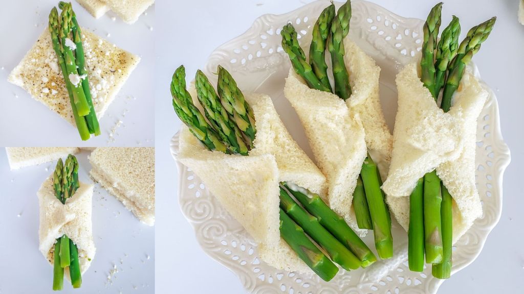 These finger sandwiches are delicate and delicious with fresh asparagus for afternoon teatime. There are only 5 ingredients and are super simple to prepare. They are something different and can be made ahead of time. They will look great on your tea time tea tray with our other finger sandwich recipes. Once made, place in a container, cover with plastic wrap, and refrigerate until ready to serve.