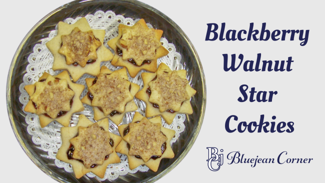 Delicious star shaped cookies layered between blackberry jam and topped with a cinnamon walnut mixture. Perfect treat to serve at tea parties.