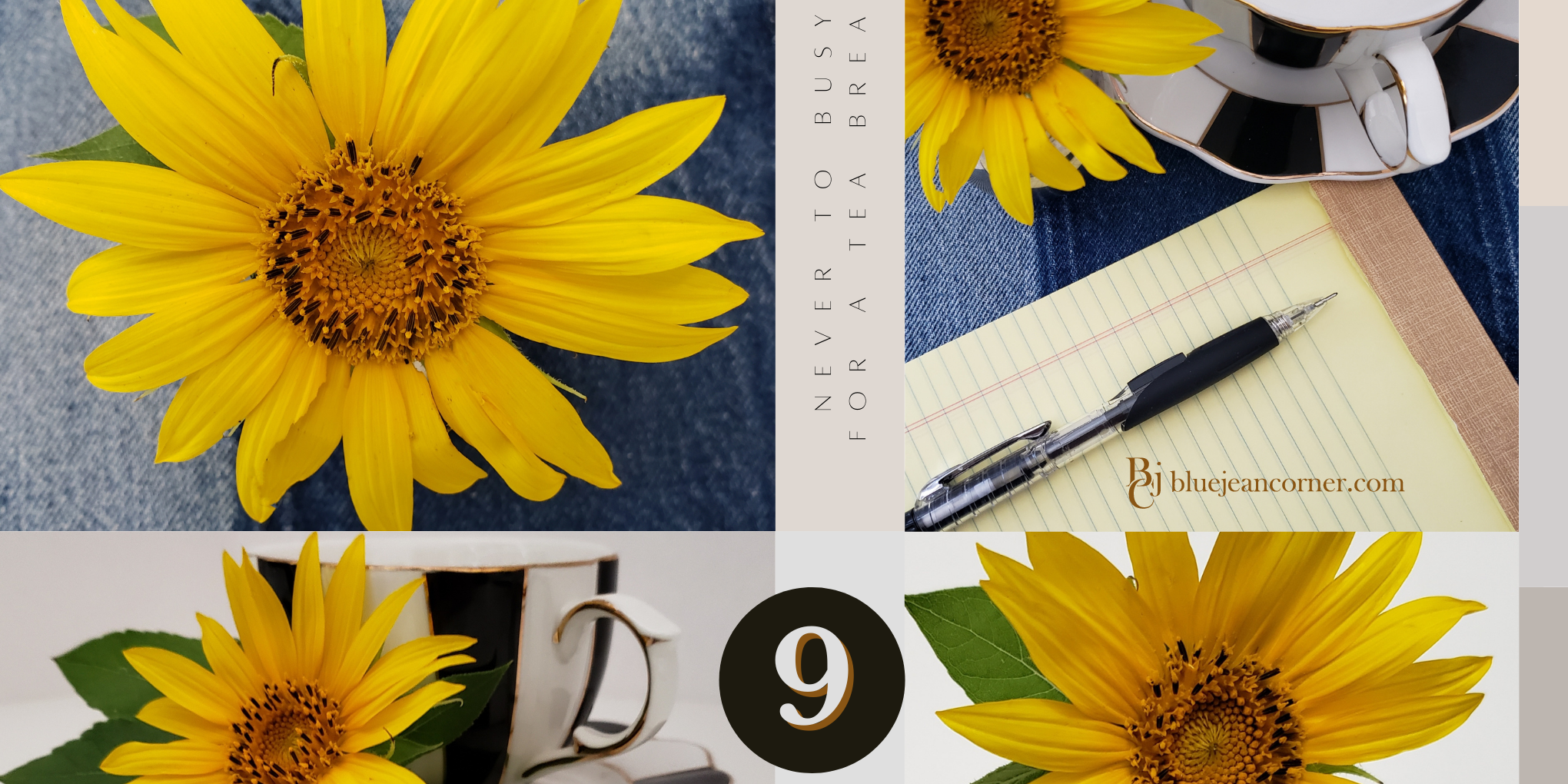 Black and white teacups with a gold trim today paired with wild yellow sunflowers.