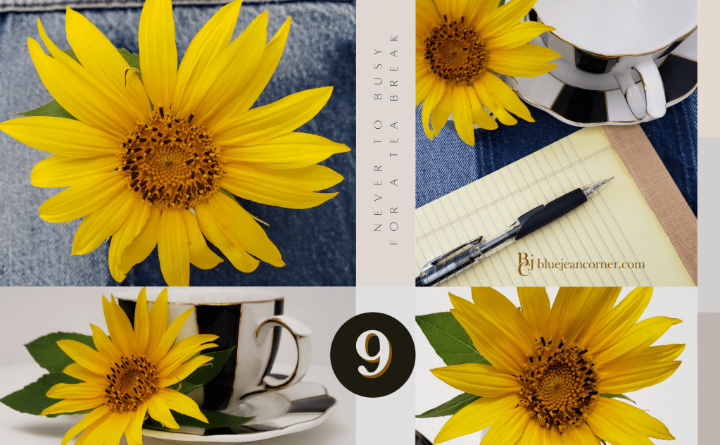 Black and white teacups with a gold trim today paired with wild yellow sunflowers.