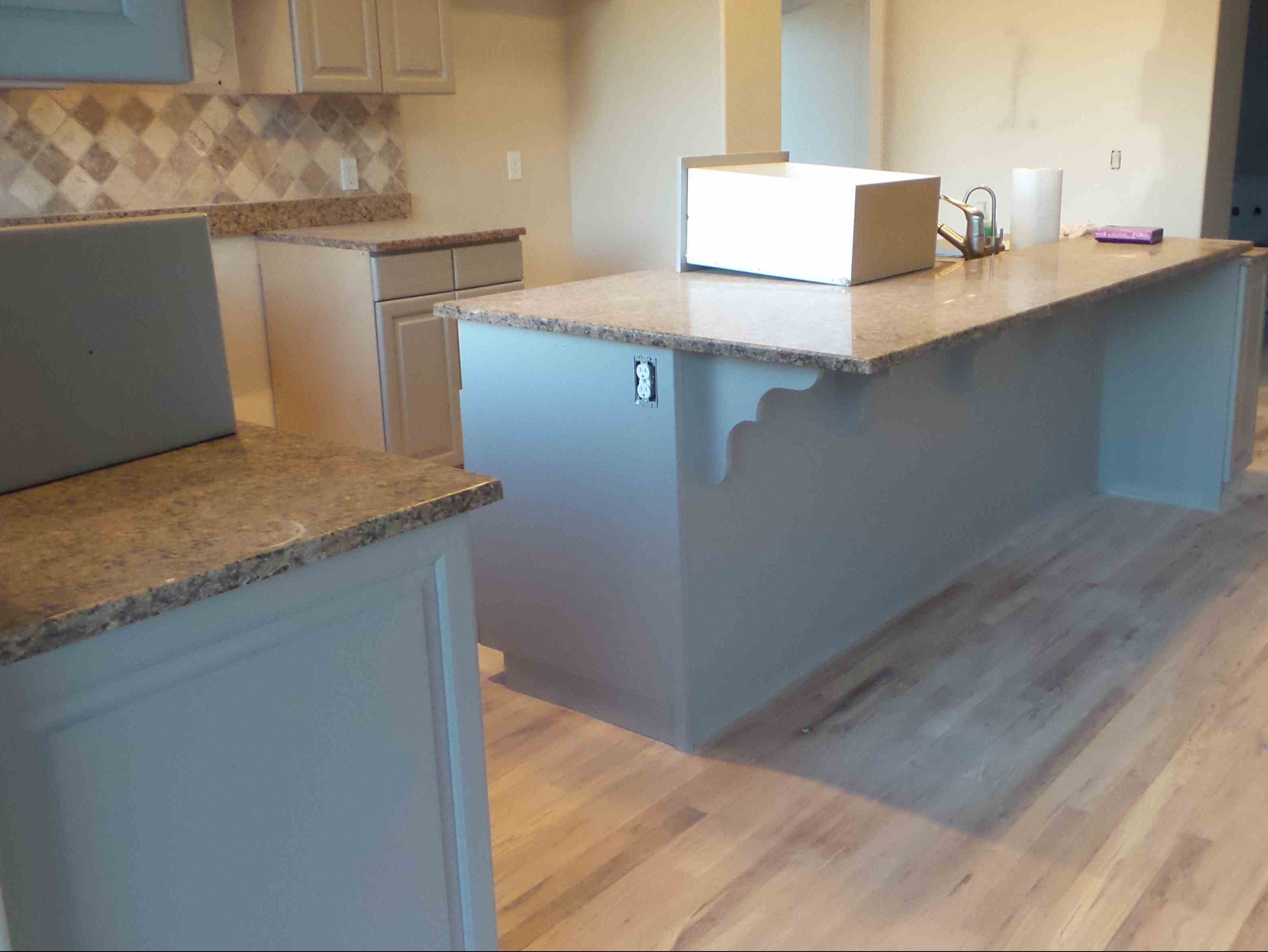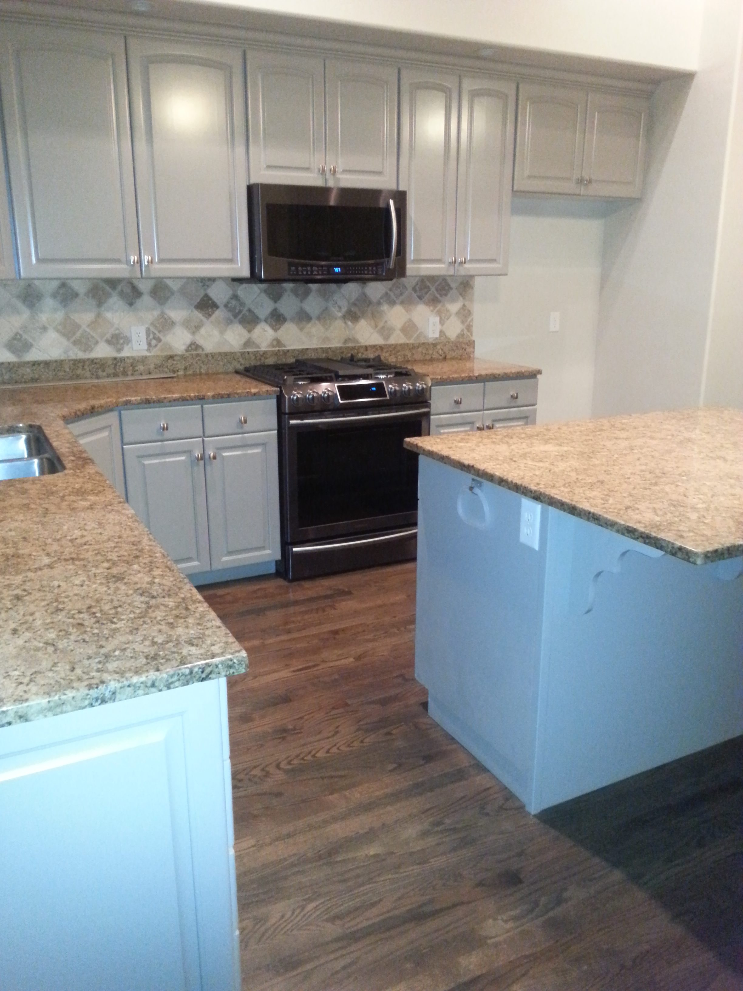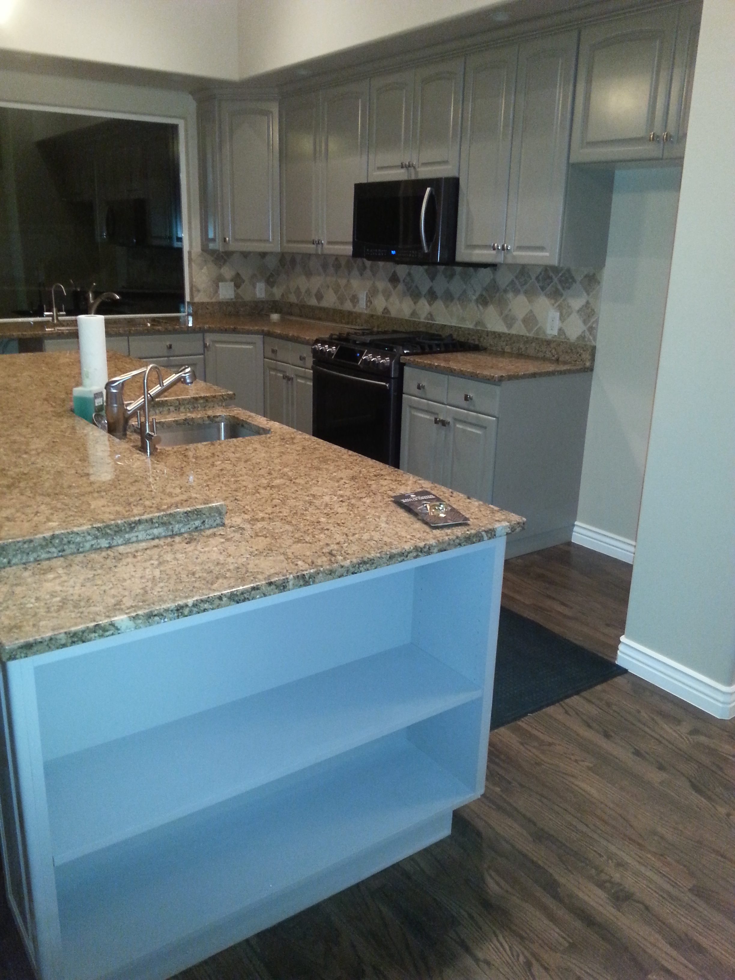 We decided to paint them and kept the counter tops and backslash tile the same. Now we had to choose a color to paint the cabinets that would blend with our existing walls and counter tops. Soft gray looked like our answer with new hardware.