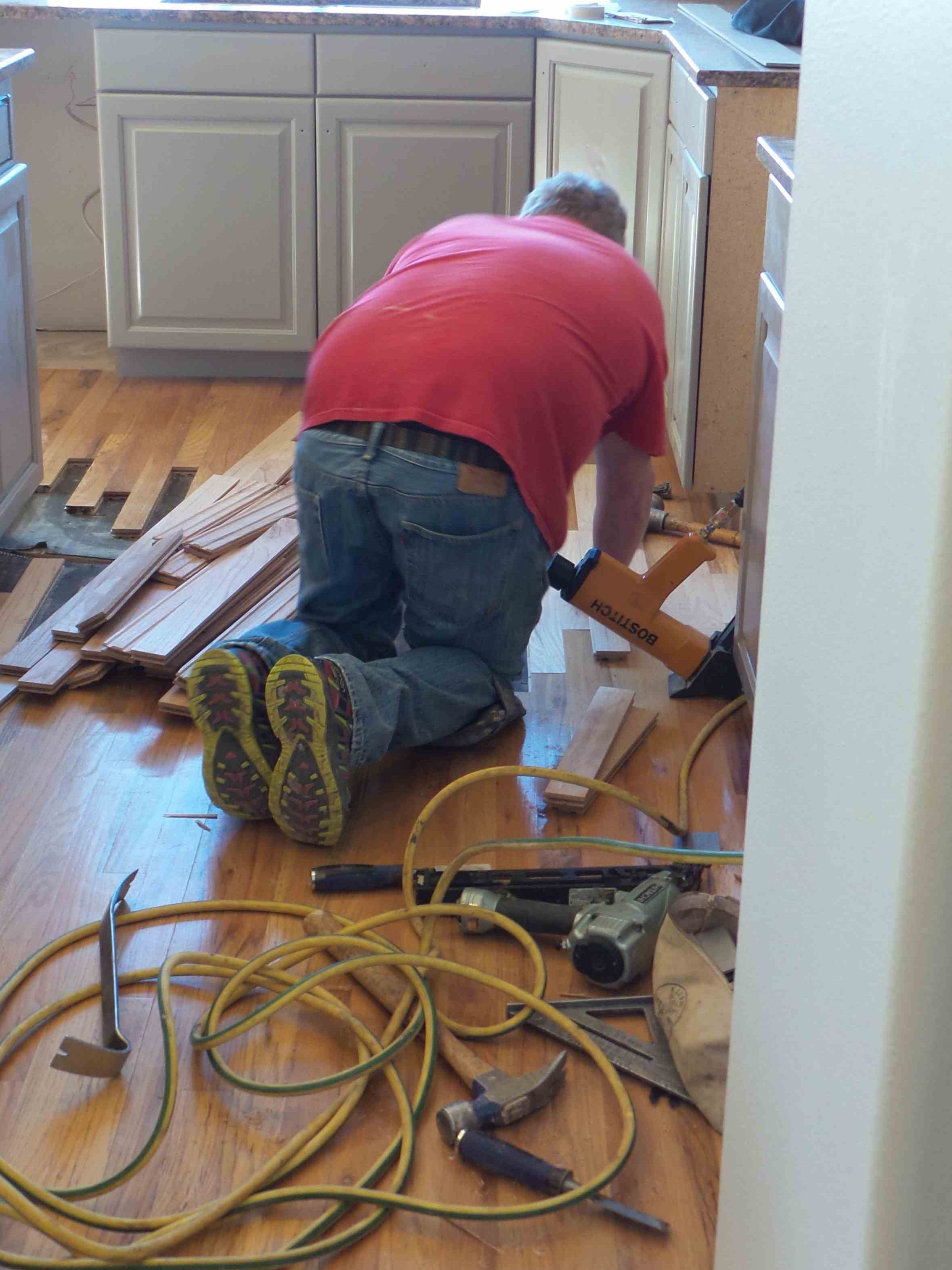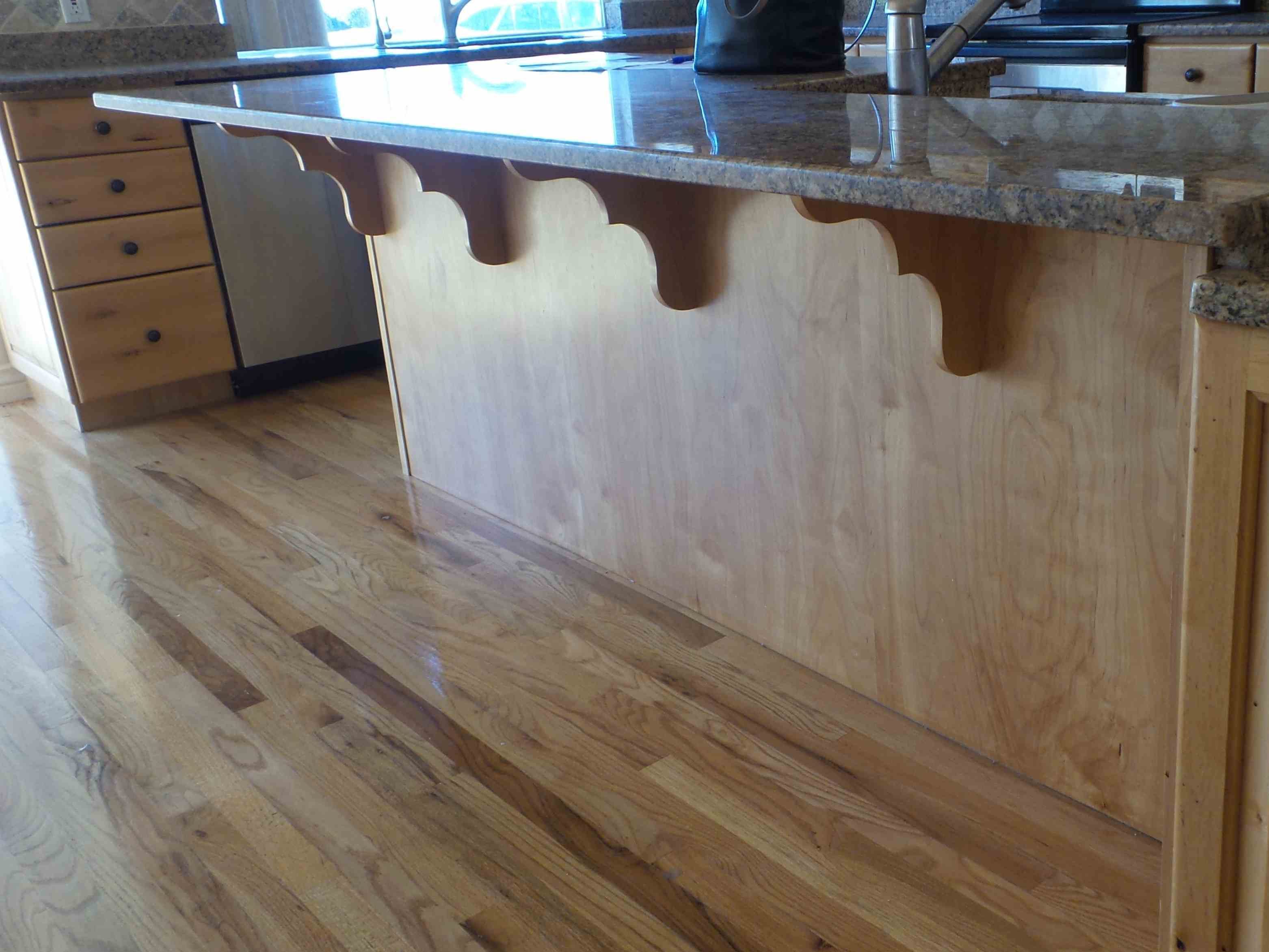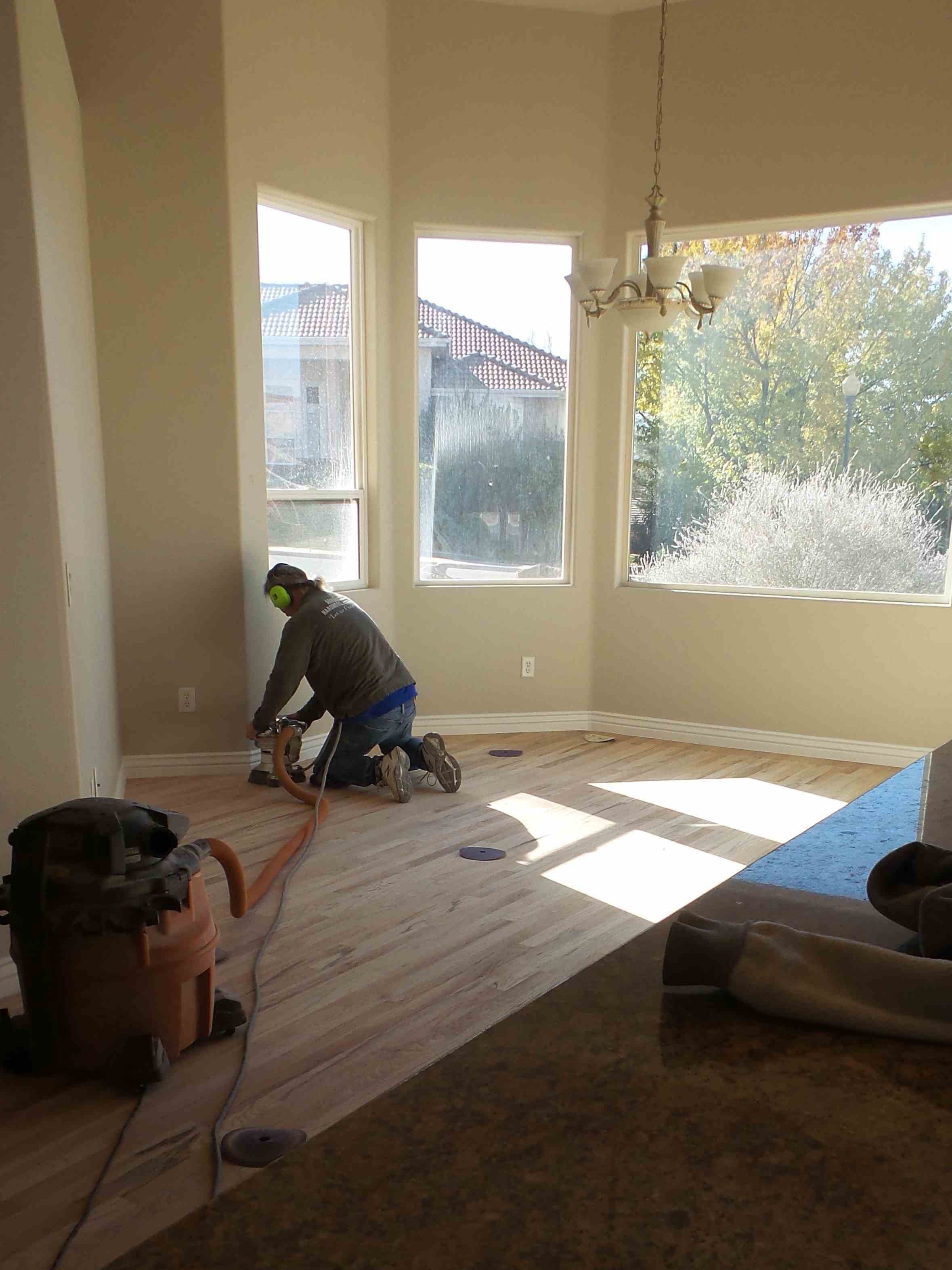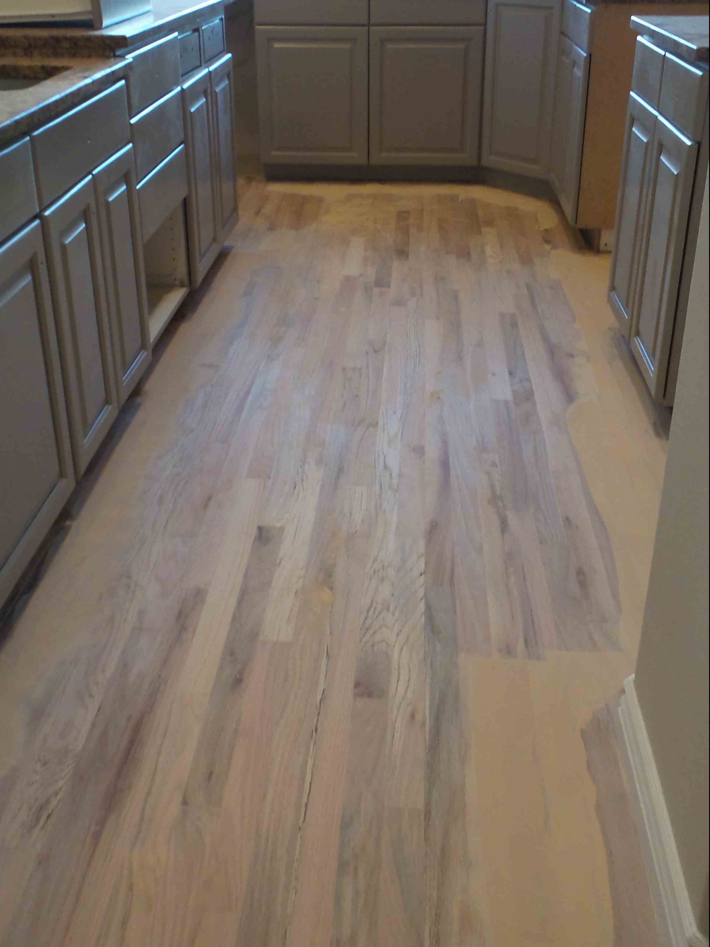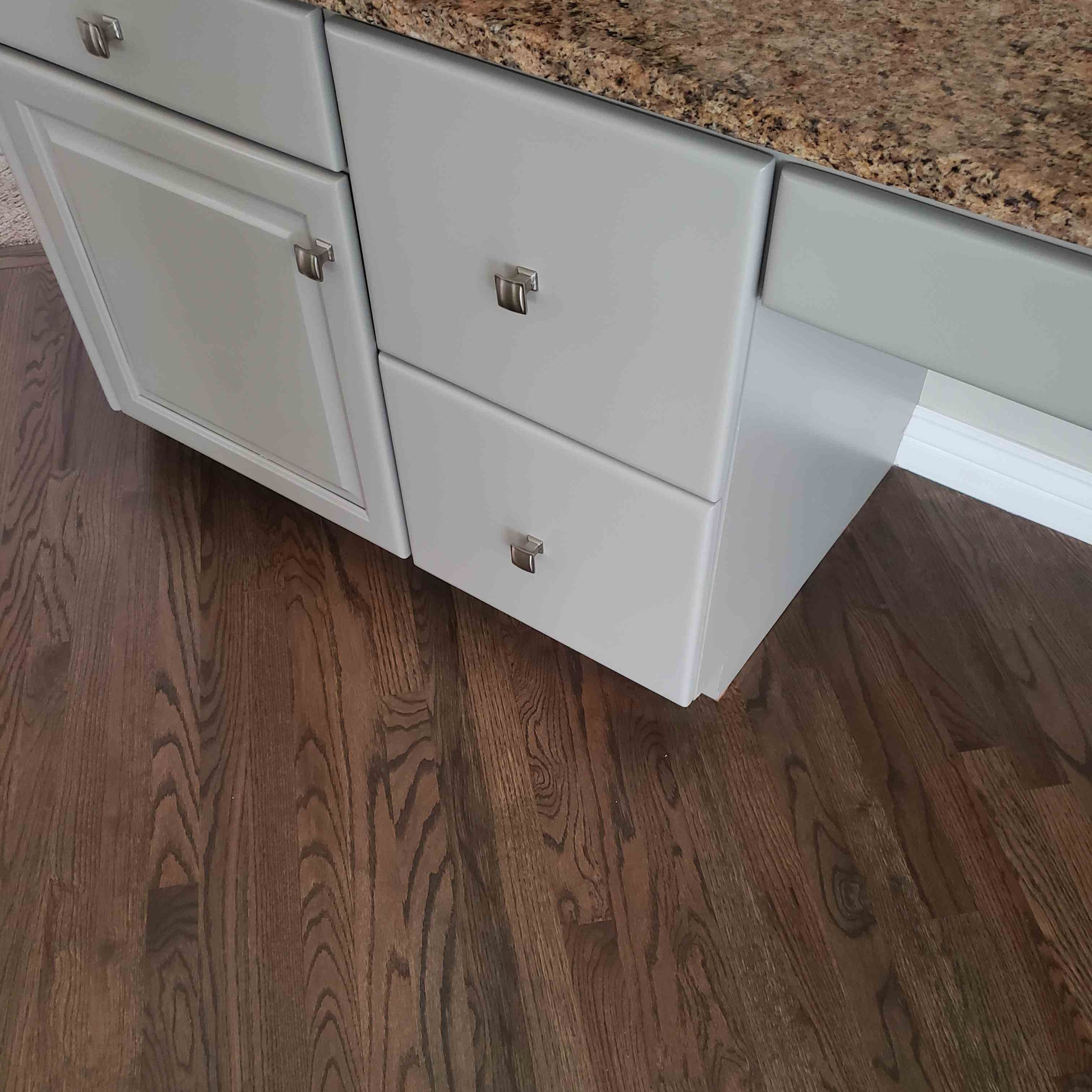 We chose a walnut stain to compliment our newly painted greige walls, white trim and soft gray cabinets. The floor remodel process consisted of sanding, staining and restoring the cut in the floor to carry power to the island in the kitchen.