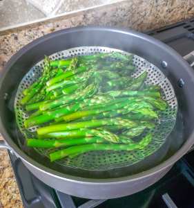 - Steam asparagus for about 5 minutes. Drain and cool on paper towels.