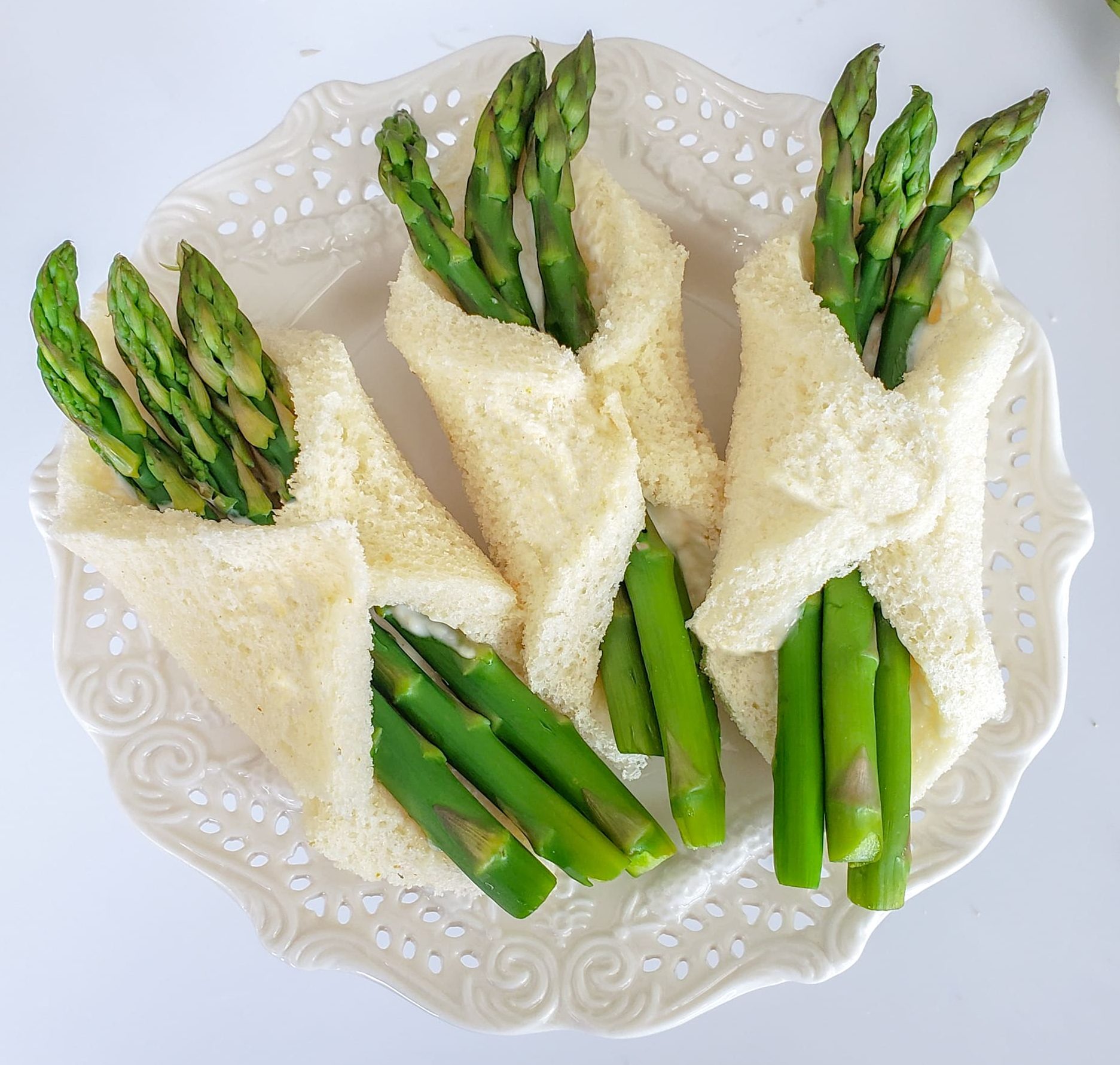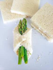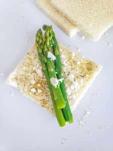 - Lay 2-3 pieces of asparagus on each slide of bread.