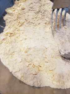 - With a blender or fork add the butter cut into 1/2 inch cubes to the flour mixture. Mix until the mixture resembles coarse crumbs.