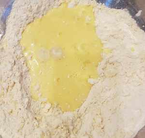 - In another bowl, add milk, eggs, and lemon zest and stir well together.