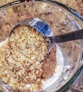 - In a small bowl prepare the topping by stirring flour, brown sugar, chopped walnuts, and cinnamon.