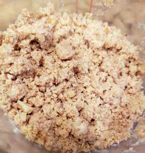 - With a blender add butter and blend the mixture until it resembles coarse crumbs and set aside.