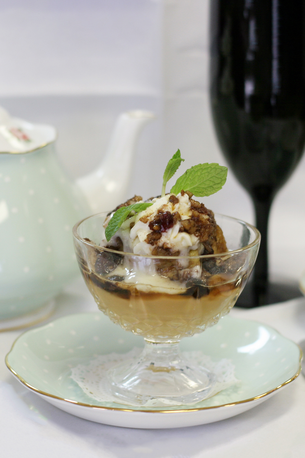 - Spoon bread pudding into an individual teacup, layer with butterscotch pudding