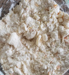 - Next, add frozen butter into mixture. Use your hands to work in butter until the mixture looks like a coarse meal.