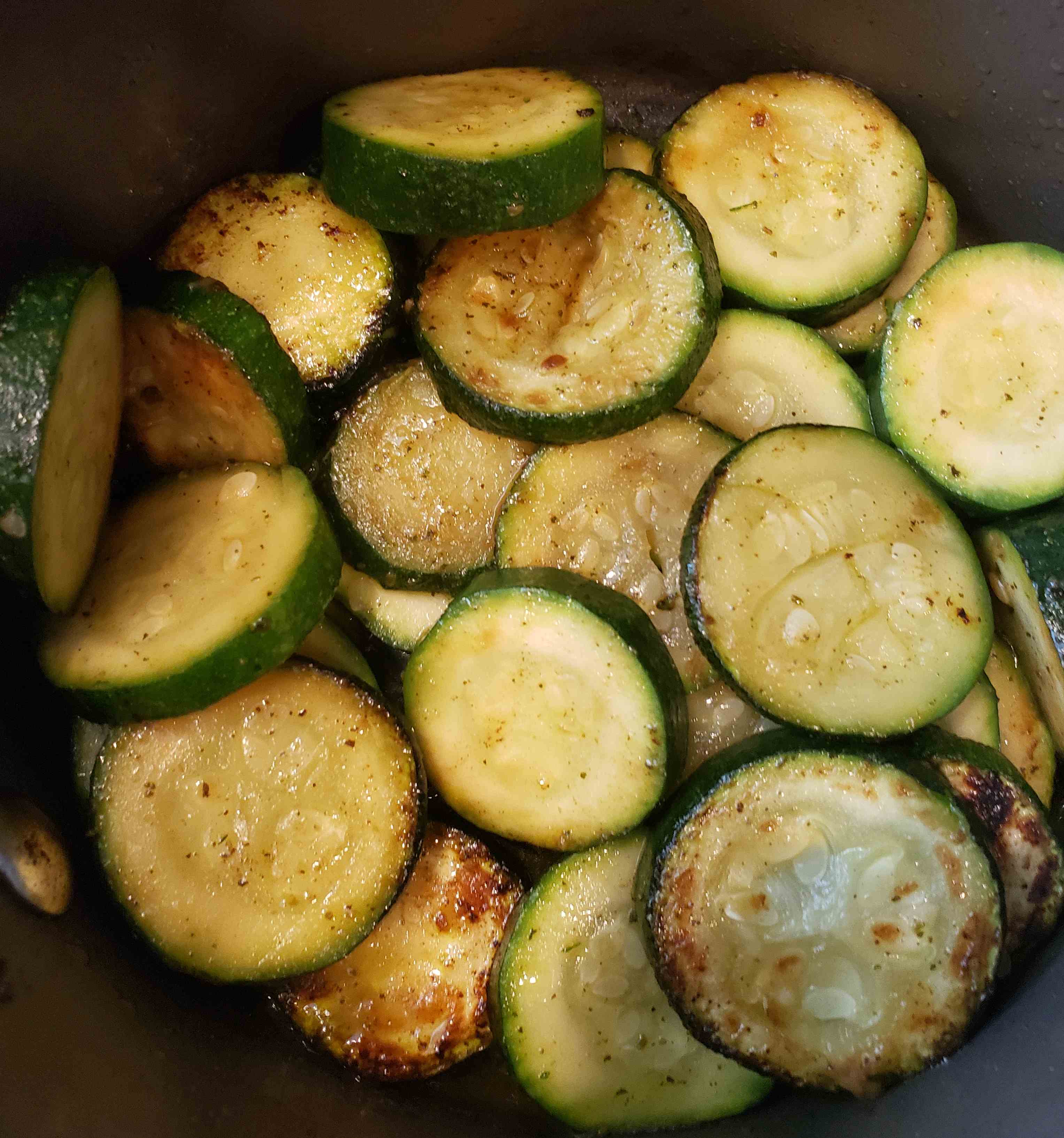 - When hot add the sliced zucchini. Turn as needed till both sides are golden brown.