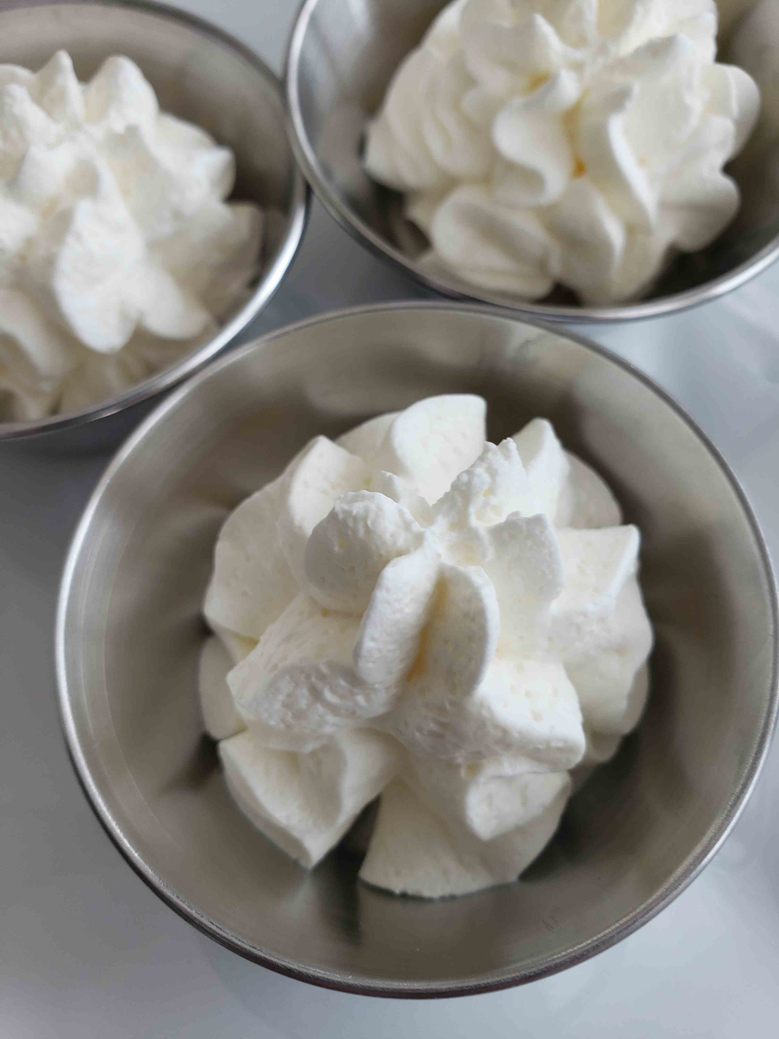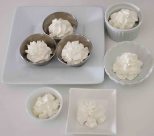 - Place the whipped sweet cream in a pastry bag fitted with a large open star tip. (Wilton #1m). Pipe the sweet cream into small dishes.