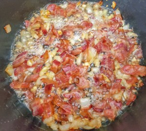 In a large pot, cook cut up bacon, chopped onions, and garlic on medium heat until crisp. Remove bacon, onion, and garlic and drain on a paper towel. Save it for a garnish on top of the soup. Keep bacon drippings in the pot for later.