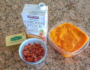 In the same pot with the bacon drippings add mashed sweet potatoes, and two tablespoons of butter.