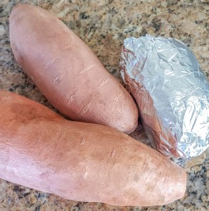 Bake sweet potatoes the day before. Wash and dry the sweet potatoes cleaning any bad spots. With a fork or knife poke holes in the sweet potato then rub with butter and wrap in foil. Place the sweet potatoes in a baking dish. I like to line the dish with foil for easy cleanup. Bake in the oven at 400 degrees for 1 - 1 1/2 hours.
