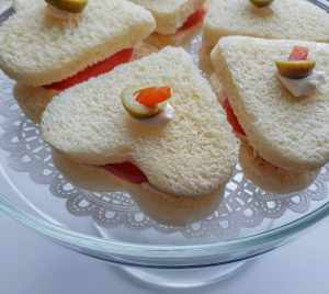 - Use a small dollop of cream cheese on the top of the sandwich and add a green olive slice with pimento.